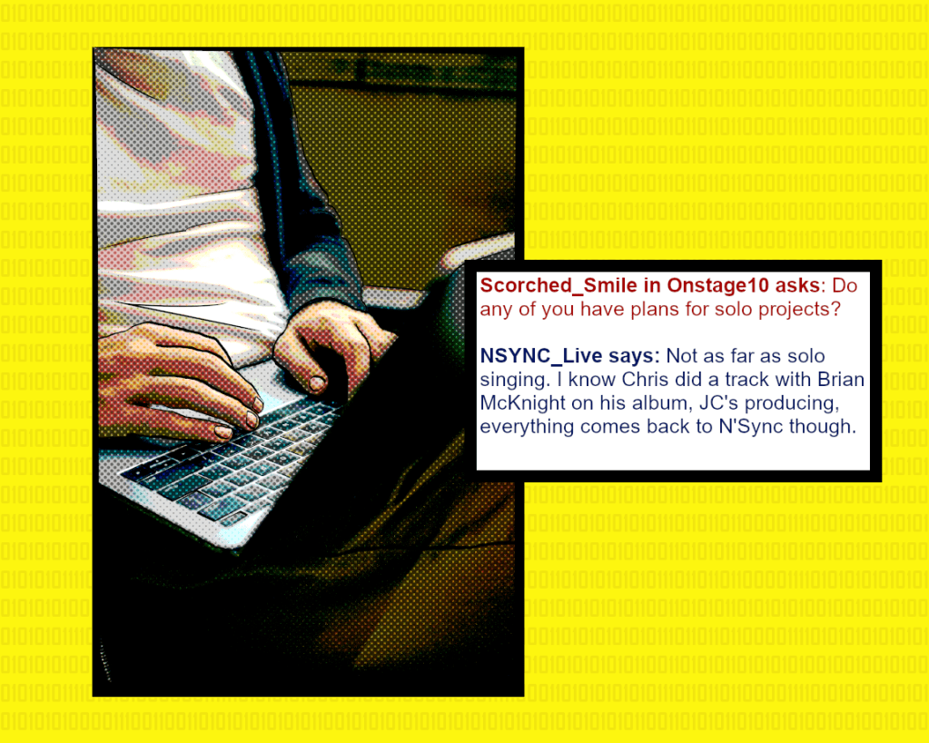 MSN hosted a live chat for their Artist of The Month, which was *NSYNC. A fan-operated news page claims that Joey was the only member of the group who participated in the chat*. A fan asked if the group had plans for solo projects. There was a mention of JC producing [music] and Chris** on Brian McKnight’s album but a denial that anyone in the group had plans for solo singing.