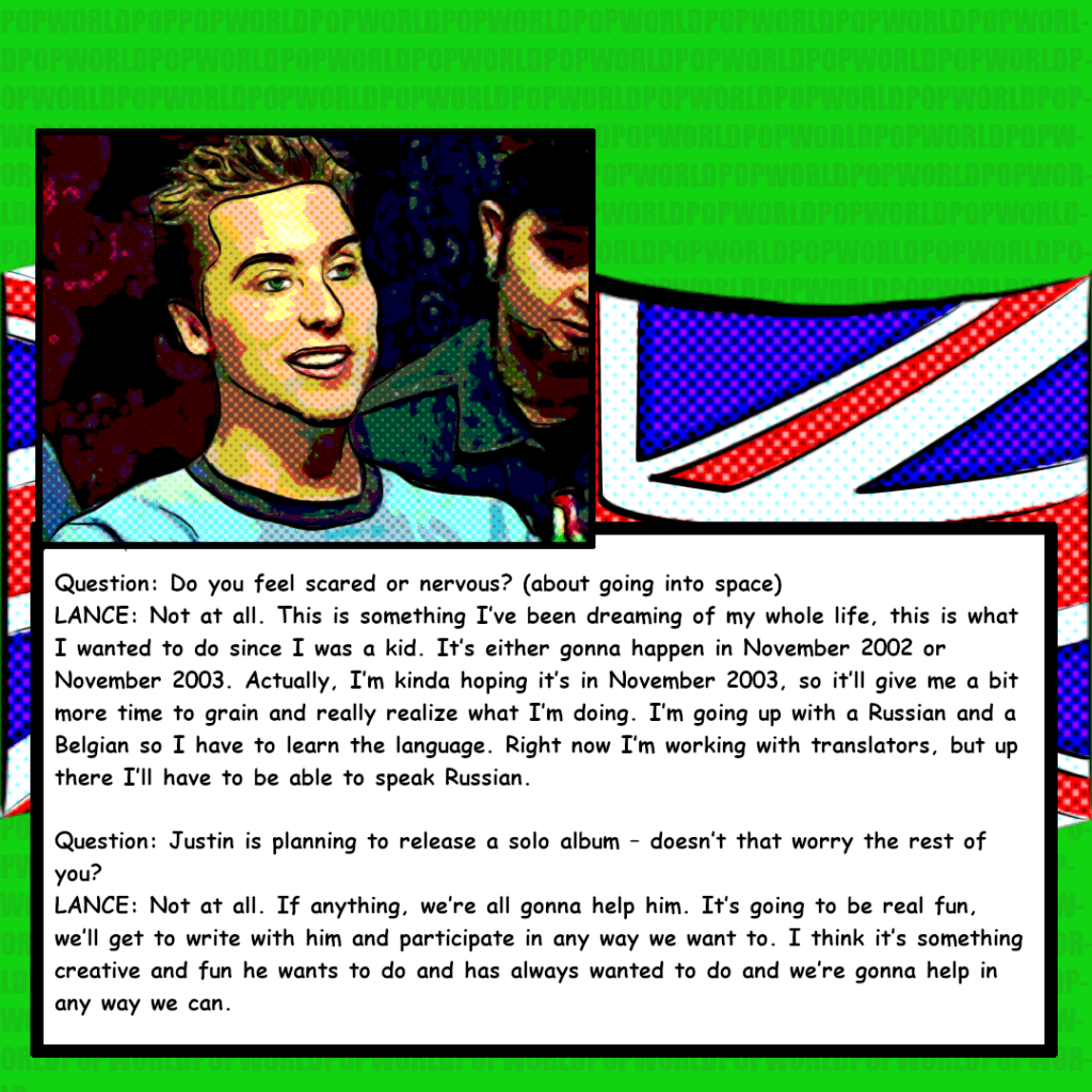 1) and 2) The fan site DigitalJCChasez.net features a transcribed interview from PopWorld.