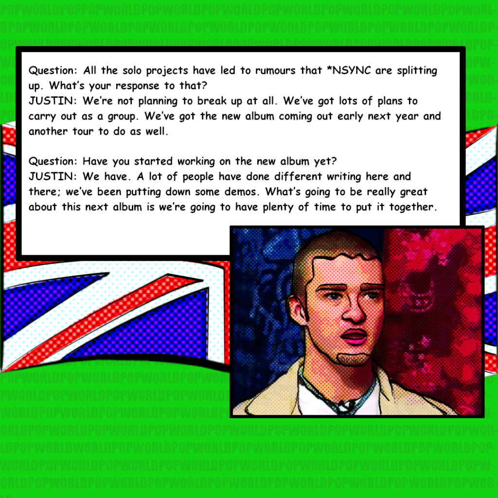 4) In an Entertainment Weekly article about Britney Spears and Justin Timberlake’s professional and romantic lives, an unnamed Jive spokesman was quoted as saying that there was no JT album scheduled and that *NSYNC would be working on a new album in the summer.