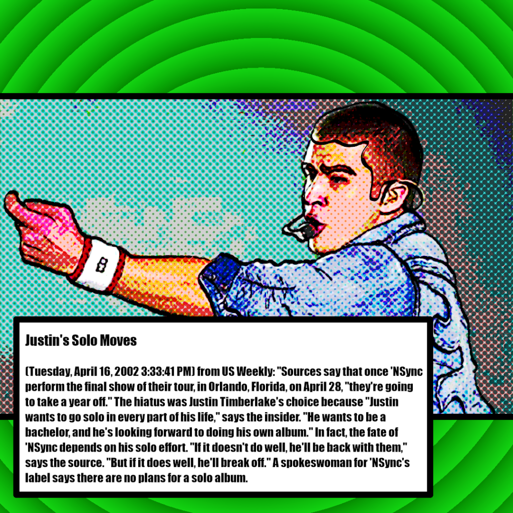 3) The *NSYNC Studio fan site cites an US Weekly article claiming that the group’s hiatus would be 1 year long. The article also supposedly claimed that the prospects of *NSYNC reuniting hinged on whether Justin’s solo album was successful or not.