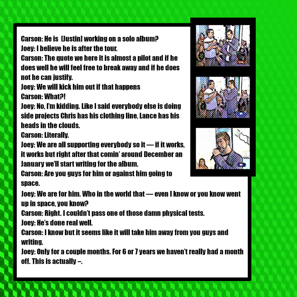5) Pop Dirt.com published a transcript for an interview on MTV’s TRL. According to this transcript, Joey Fatone told Carson Daly that *NSYNC would be taking a break for the rest of the year.