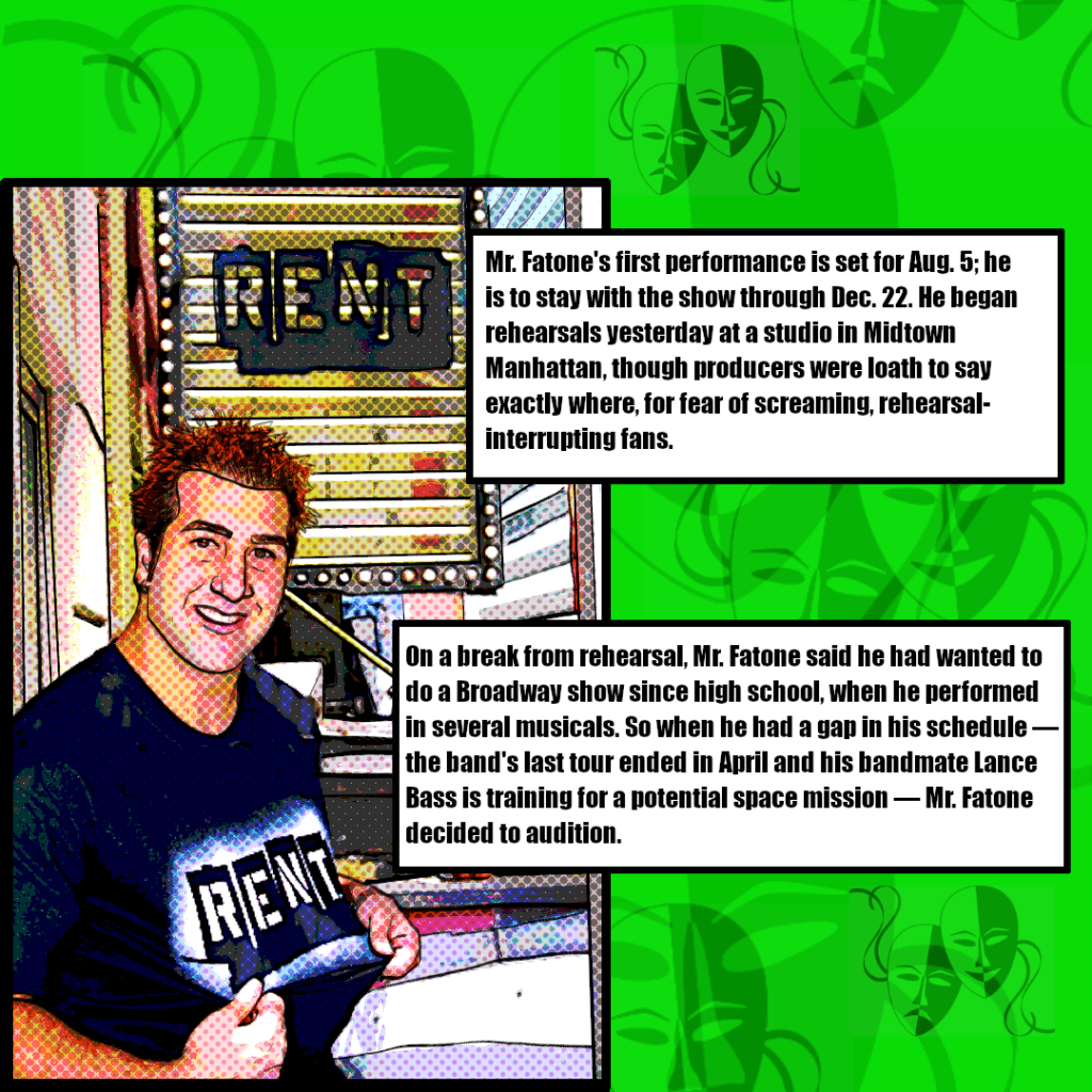 1) The New York Times published an article about Joey Fatone’s Broadway debut in the musical RENT. The author mentions that a gap in his schedule (i.e., the hiatus) gave him the opportunity to audition for the play.