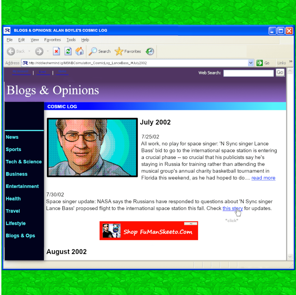 Joey Fatone’s Broadway debut in RENT receives coverage from The New York Times, linking the group’s hiatus to new artistic pursuits. Lance Bass was formally nominated for space travel by M.V. Sinelschikov of the Russian Aviation and Space Agency, and MTV.com reported that a contract had been signed for his participation in the Soyuz mission. Alan Boyle continued chronicling Bass’s journey on the Cosmic Log, while MSNBC’s Science and Tech section published a separate article detailing his training. A short segment aired on Access Hollywood, and a fan-circulated transcript—linked by Popdirt.com—claimed Joey Fatone said *NSYNC would begin working on another album the following year. These fragments, scattered across outlets and fan forums, painted a picture of a group still tethered to future plans, even as their paths diverged.