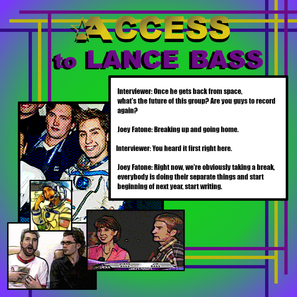 6) Access Hollywood broadcast a short segment about preparations for Lance’s space flight. This graphic contains text from a transcript that was posted in a fan thread on Abstracts.net. The transcript does not identify the speakers by name; however, Popdirt.com linked to the Abstracts thread claiming that Joey Fatone said *NSYNC would begin working on another album the following year.