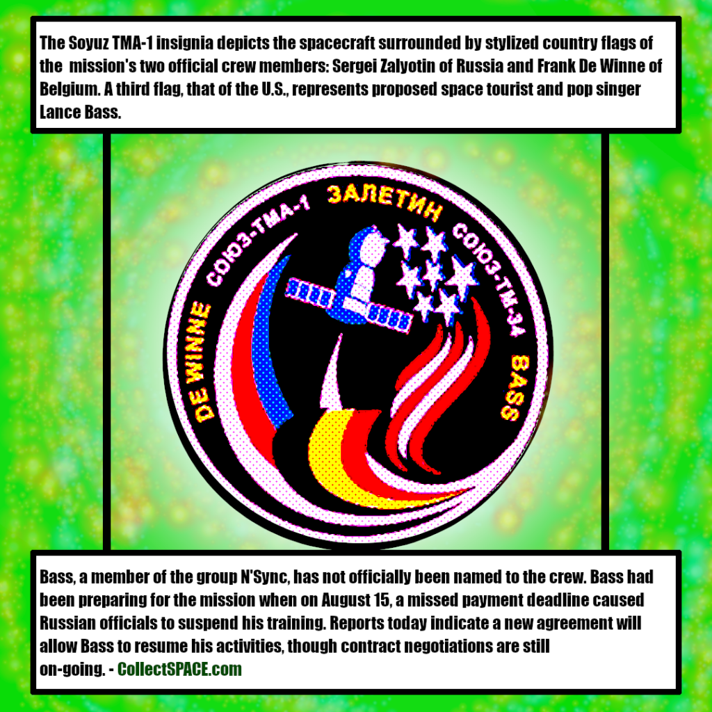 1 – CollectSpace.Com published an article featuring a copy of the space patch designed to be worn by Lance Bass on the Soyuz mission. This graphic contains a copy of the patch.