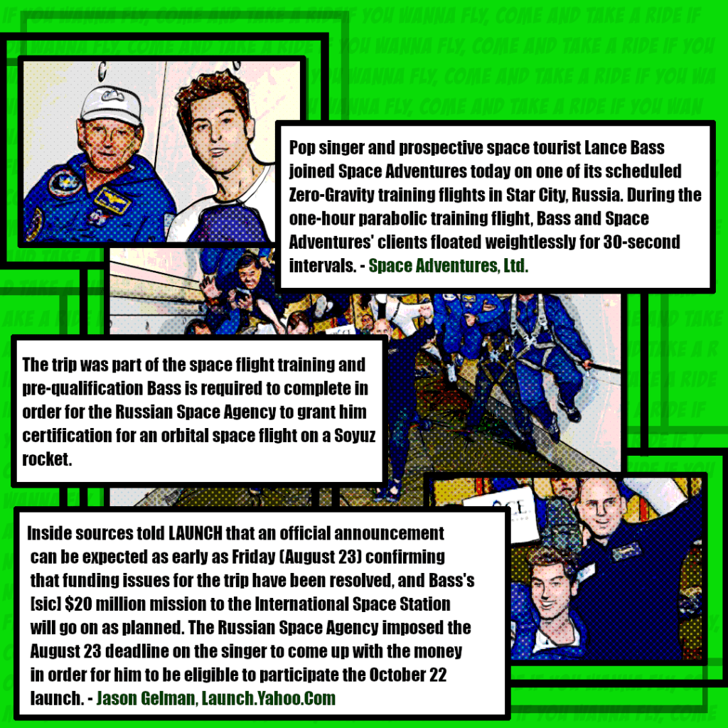 2 – Space Adventures published a press release about Lance Bass’ participation in a zero-gravity training flight.