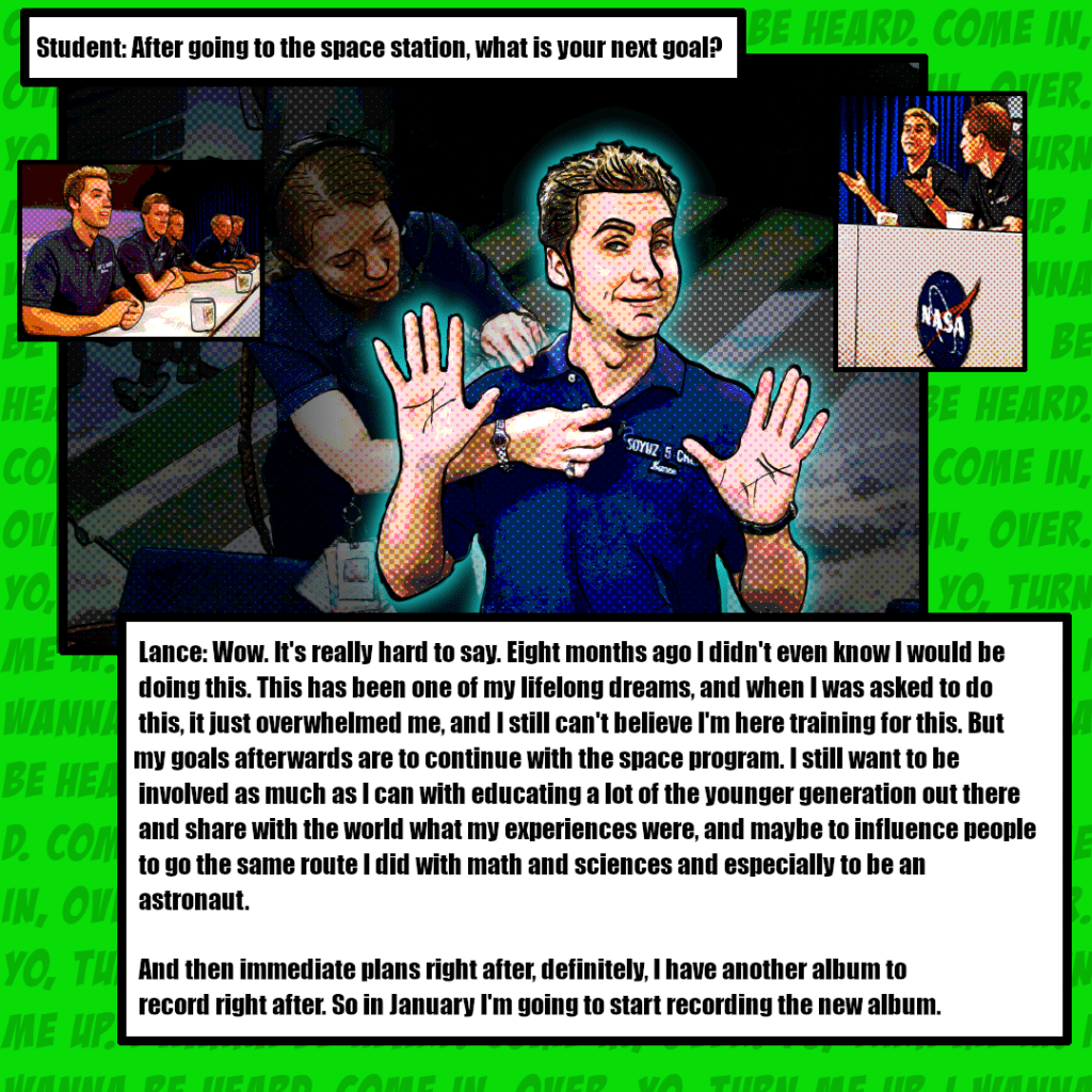 4 – The Forever NSYNC Fans website features a partial transcript of an online chat with Lance Bass. The transcript contains no identifying information about the chat but a web search reveals that the chat was hosted by NASA’s Distance Learning Outpost via the Quest web portal. This graphic contains text taken from the transcript on Forever *NSYNC Fans.