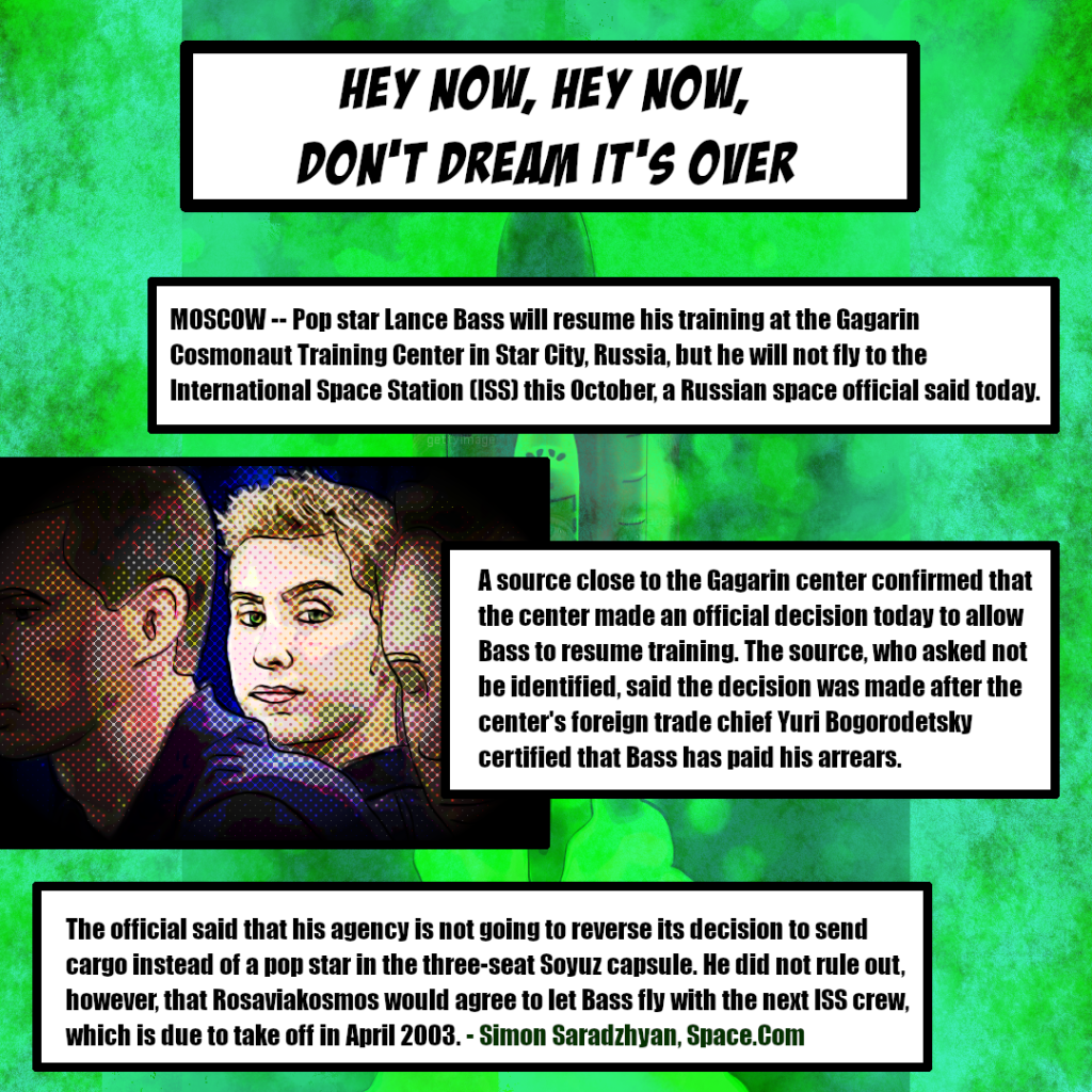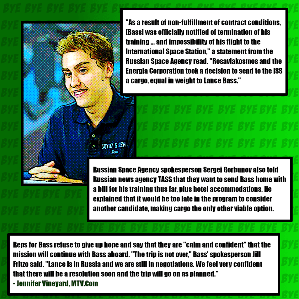 3 – MTV News reported that Lance Bass was rejected from the Soyuz mission for unfulfilled obligations.