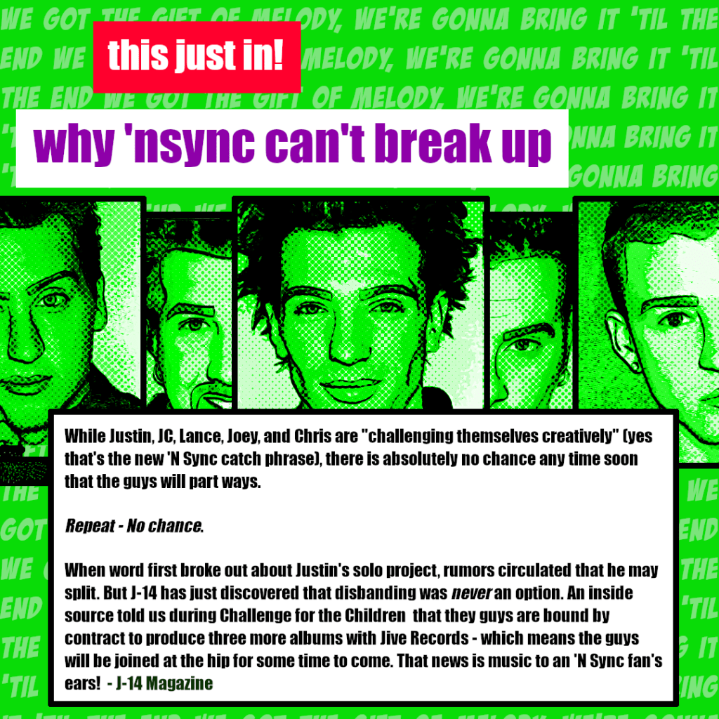 1 – A small feature claiming to explain why *NSYNC can’t break up appears as part of an article about the group’s Challenge For the Children event. A photograph of the feature was included in an eBay sales listing that has since been removed by the seller. Tertiary proof of this feature article was located on Tumblr.