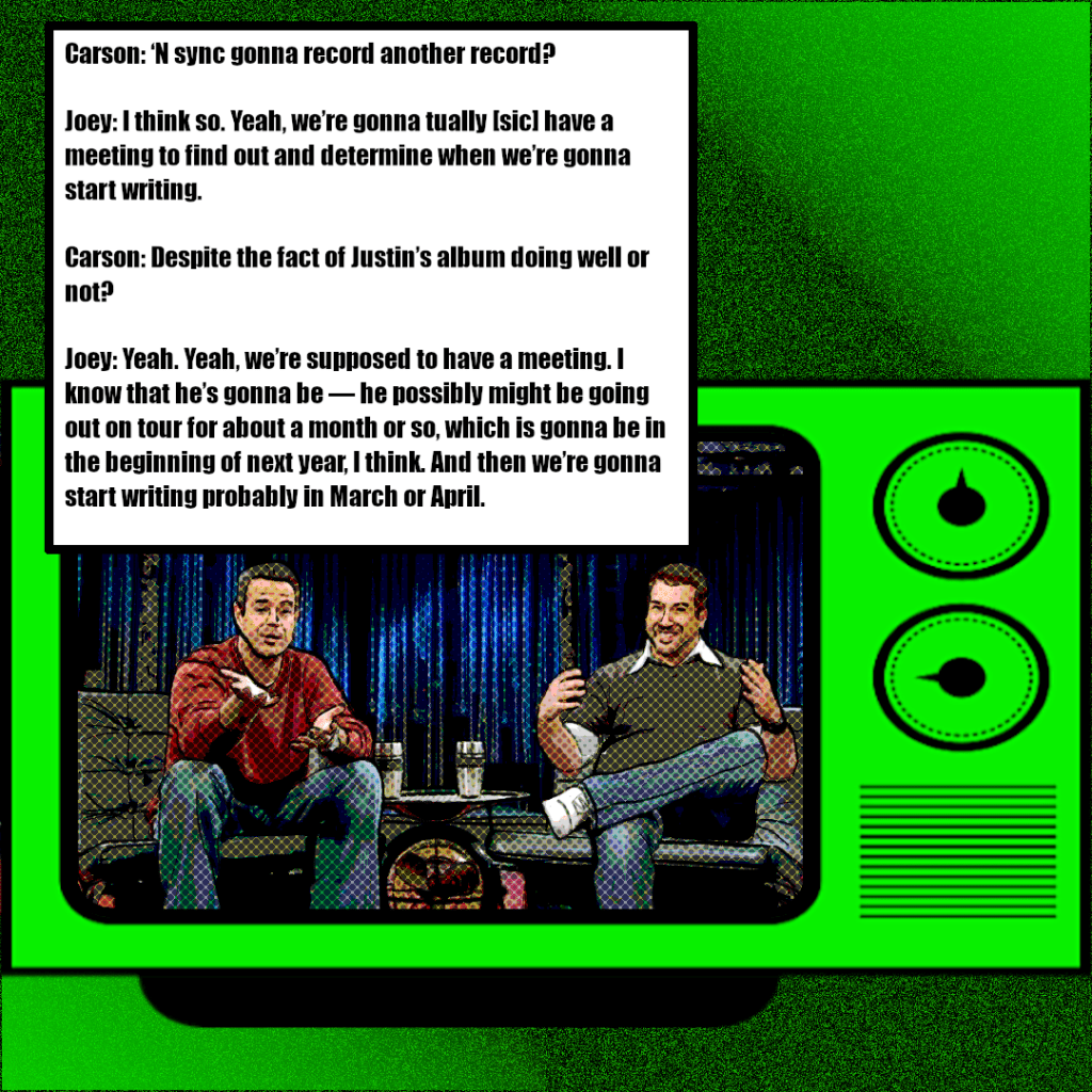 As Justin Timberlake’s solo debut neared release, questions about *NSYNC’s future lingered in both media and fan spaces. A small feature in J-14 Magazine, tied to the group’s Challenge For the Children event, claimed *NSYNC couldn’t break up because they owed Jive Records another 3 albums —an assertion preserved only through a now-removed eBay listing and tertiary Tumblr documentation. Joey Fatone appeared on Last Call with Carson Daly, where he confirmed the group was still planning a meeting to begin writing again, likely in March or April, even with Justin’s solo tour on the horizon. Meanwhile, the October 26th issue of Billboard featured a profile on Justified, quoting a Jive Records executive who praised Justin’s willingness to tour Europe—an effort the group had reportedly resisted. In the same piece, Timberlake pushed back against speculation about the group’s longevity, saying, “I get tired of people waiting for us to go away. We’re not going away, man. We’re growing and changing and making music that is real and honest. We’re not a machine.”
