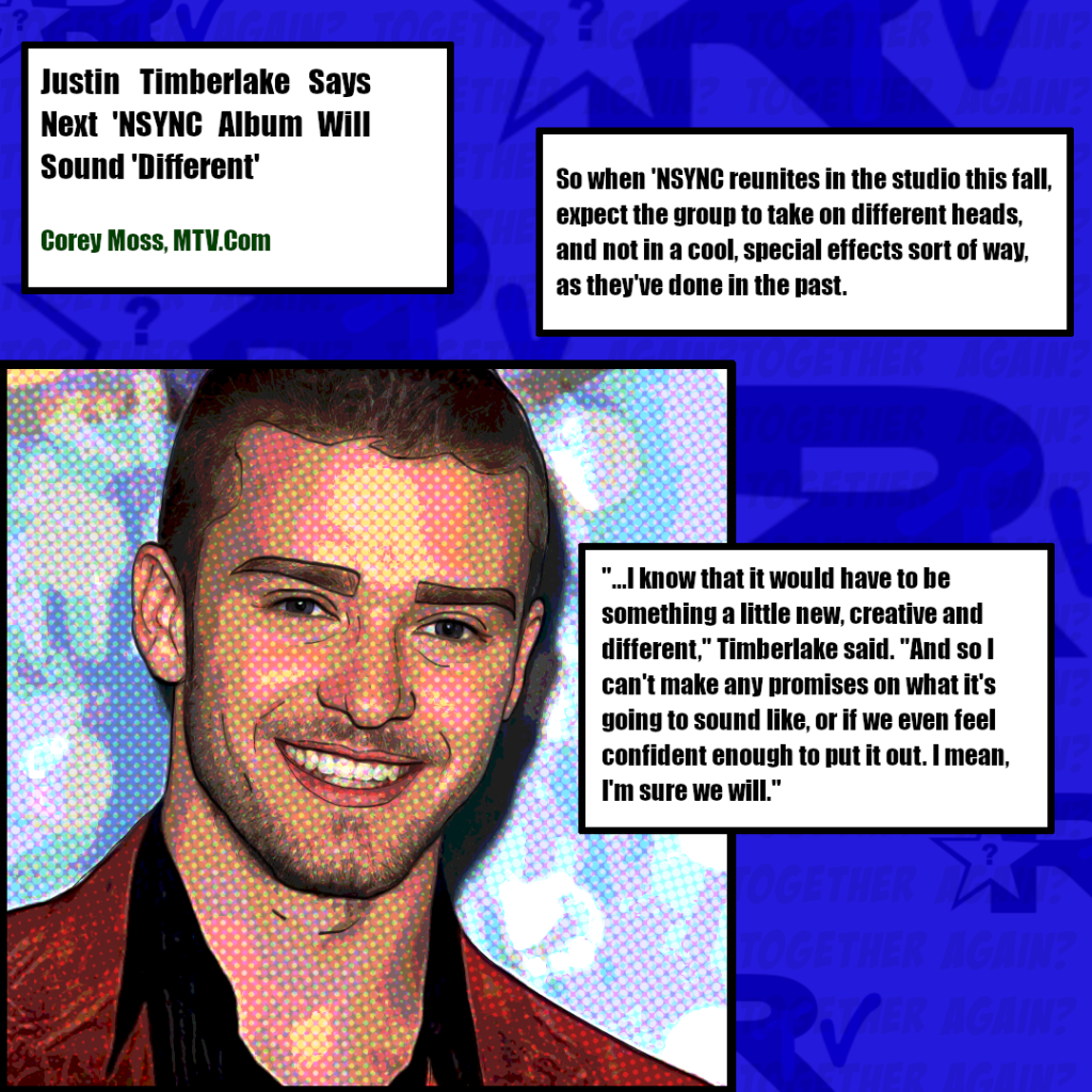 1 – MTV News claimed that *NSYNC will be together back in the studio in fall. This article featured quotes attributed to Justin Timberlake.