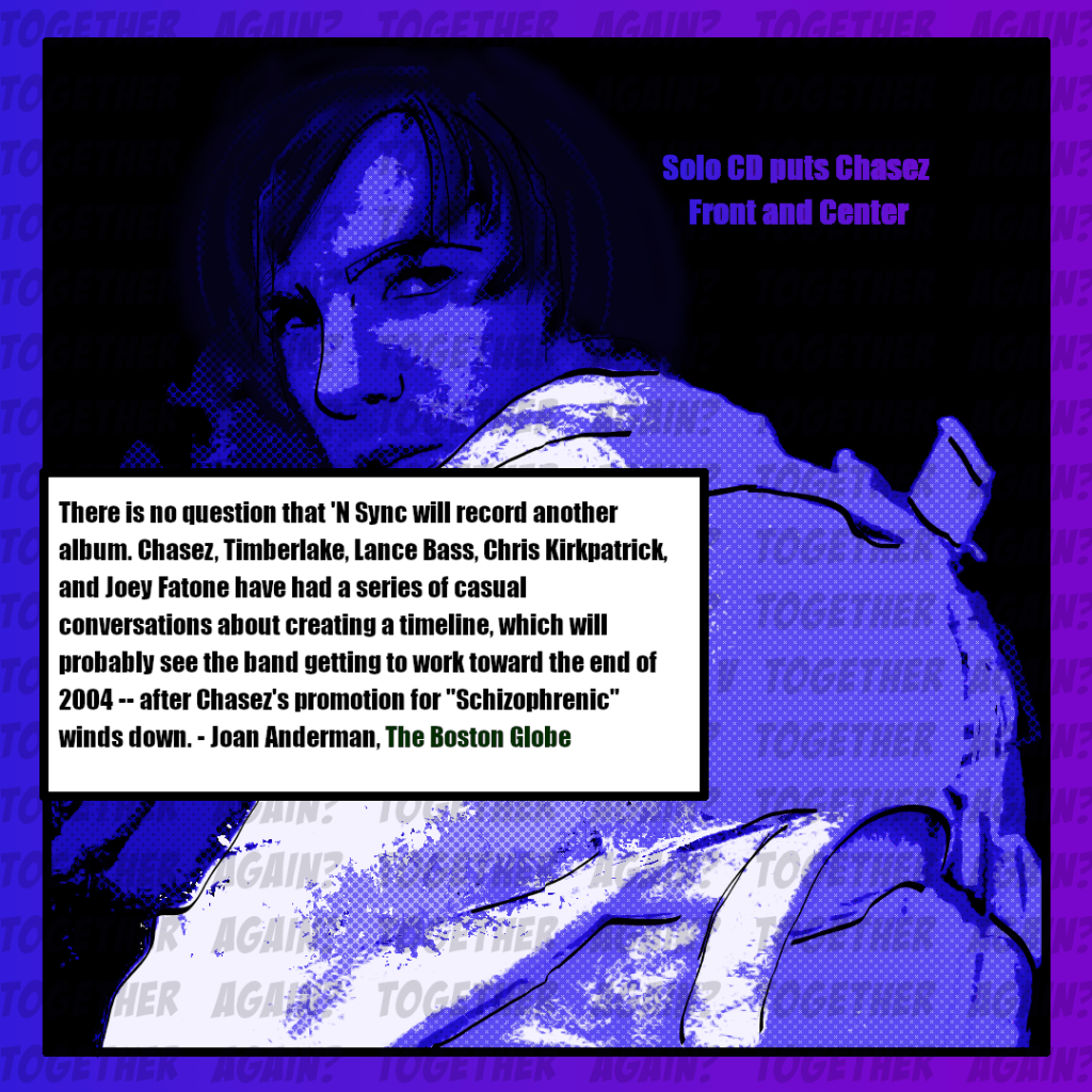 A Boston Globe article claimed that *NSYNC had only engaged in casual conversations about regrouping, with work likely postponed until late 2004 following JC Chasez’s album promotion cycle. By this point in the “hiatus”, the reunion timeline had shifted from seasonally specific to speculative.