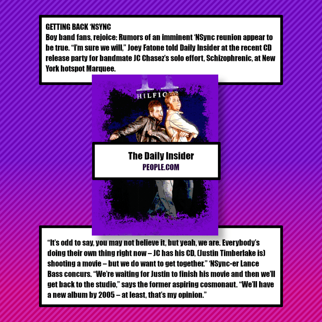 4 – People.Com’s Daily Insider featured a blurb about *NSYNC with quotes attributed to Joey Fatone and Lance Bass.