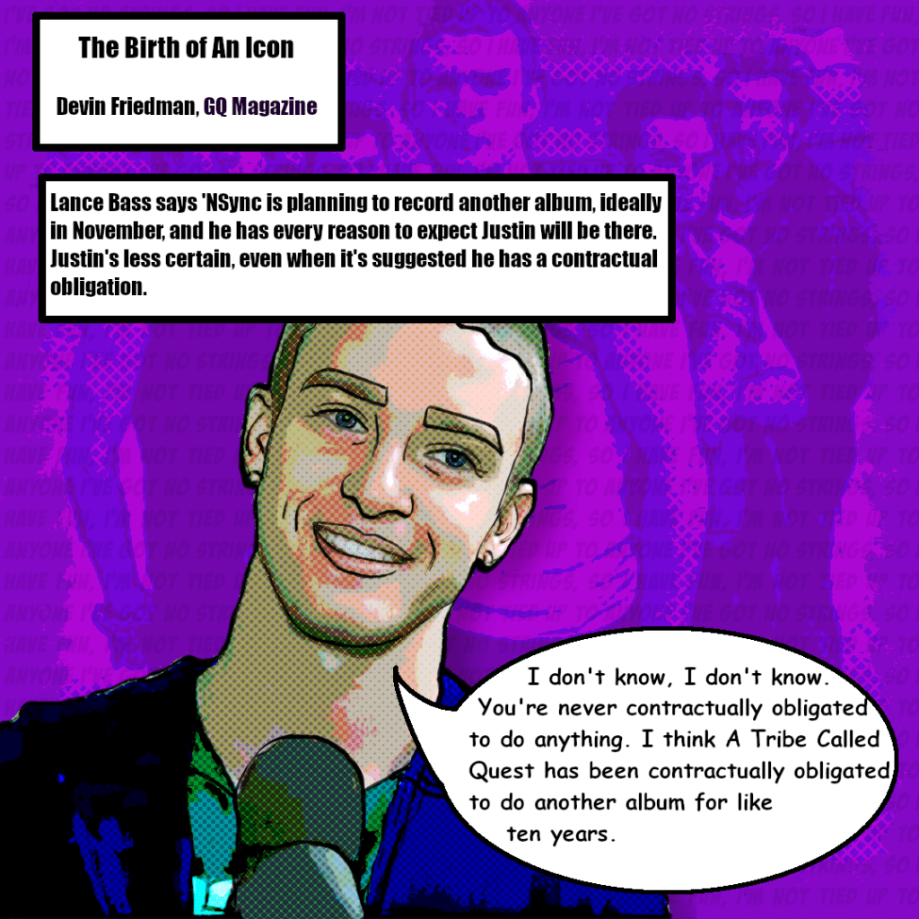 1 – This graphic features content from the September 2004 issue of GQ UK, which was on sale in August. The original article is not currently available via GQ’s website or public archives. A transcribed copy of the interview was located on a fan-hosted website. The quote attributed to Justin Timberlake has been corroborated by an archived MTV News update published the same year.