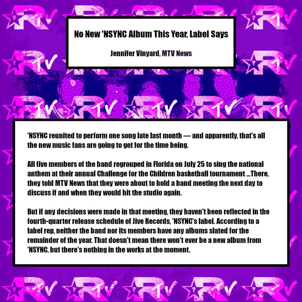 2 – MTV News reported that *NSYNC had reunited to perform the national anthem at their annual Challenge for the Children event, but no new music was planned. Although the group mentioned an upcoming band meeting to discuss future recording, Jive Records confirmed that no releases were scheduled for the remainder of the year.