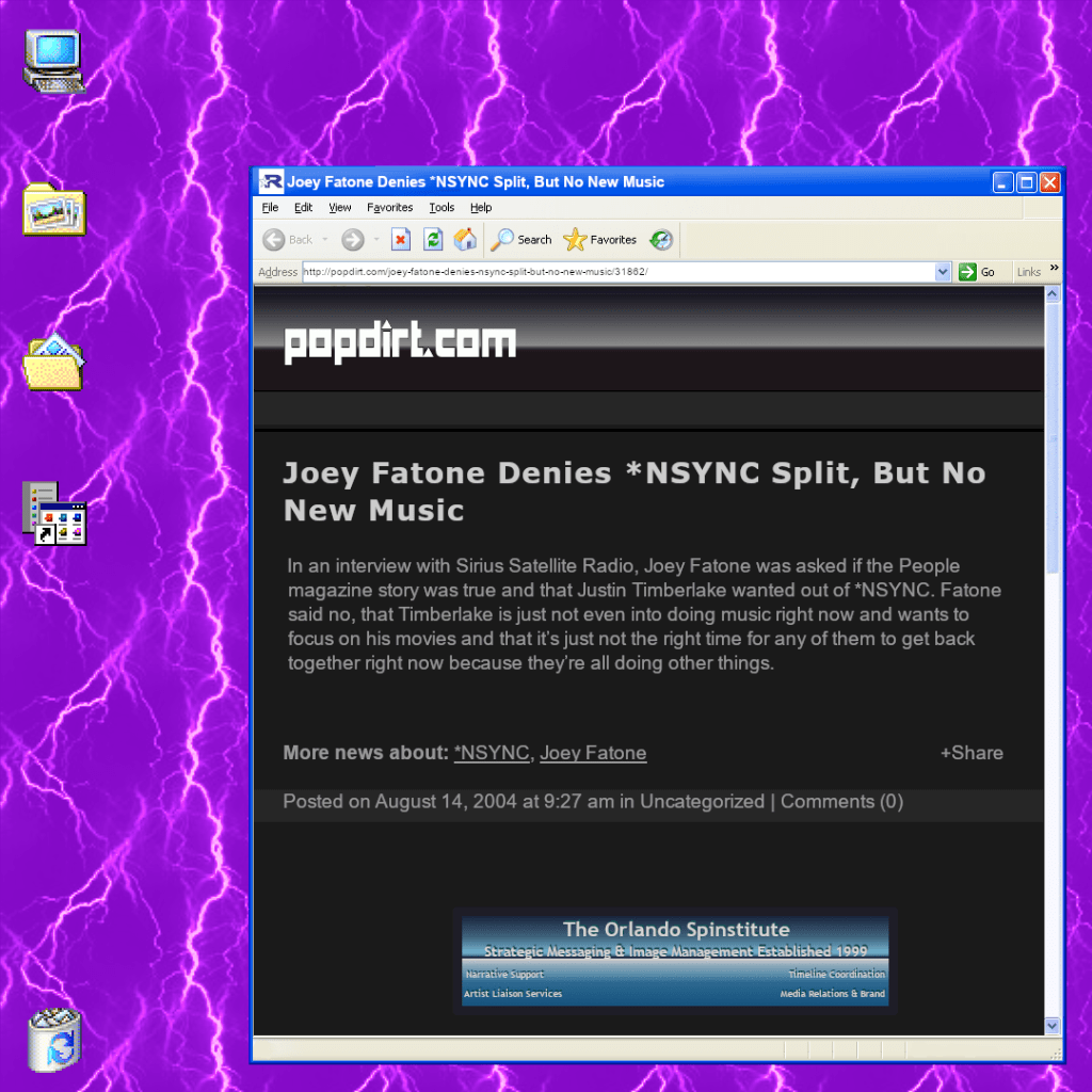 Current Link: https://web.archive.org/web/20210414143251/http://popdirt.com/joey-fatone-denies-nsync-split-but-no-new-music/31862/